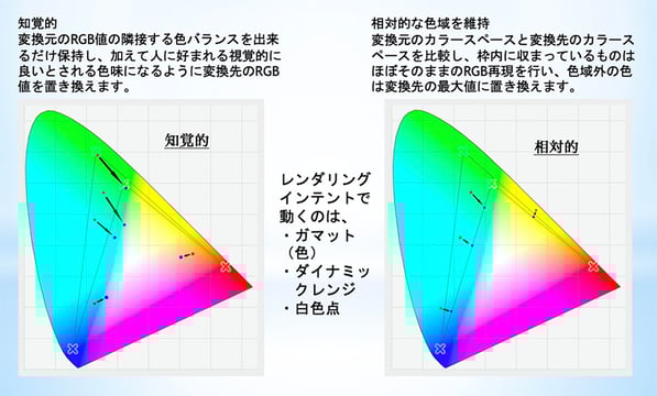 「知覚的」:変換元の画像にある色(RGB値)の配置を変換先の小さい方の色空間の中で出来るだけ「似たようなバランス」で再配置します。全体的にいわゆる圧縮のようになるので、露出が下がるとかコントラストが変わるとか画像によりますが、見た目が少し変わります。*各種メーカーの色作りが作用します。