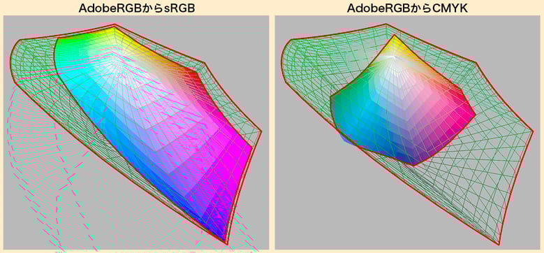 SNSでもよく見かけるのが、印刷すると緑の鮮やかさが無くなり燻んだり、黒の締まりが無くなったりしてしまうというお話ですが。上の図でも分かるように、そもそも表現できる色に限界があります。これを理解していないといつまでも先に進みません。