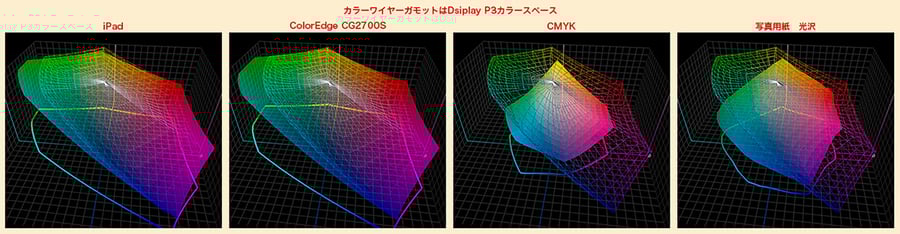 *上の画像は、カラーワイヤーのガモットは「Display P3」です。薄くカラーで表示されているのがそれぞれのデバイスや印刷、プリント出力のプロファイルです。左から「iPad」「ColorEdge CG2700S」「CMYK」「写真用紙 光沢」です。