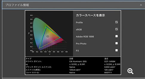 *最新のMacBookProとCalinriteのソフトを使用すると表示色空間を変更することが出来ます。