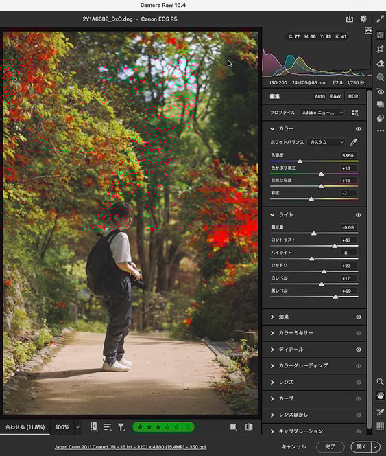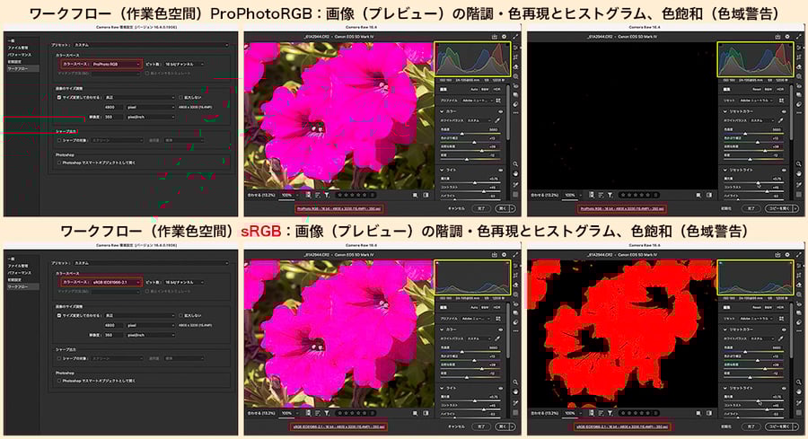 ワークフロー(作業色空間)を書き出しのカラースペースに合わせることで、その「書き出し先の色空間」では、どの色が飽和、階調破綻するのかを『プレビュー・ヒストグラム・色域警告』で確認することがRAW調整で「目的に合わせた画像」作成になります。