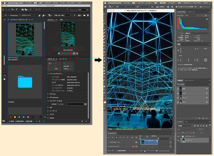 色やコントラスト、その他の色調縫製を行いたい「動画ファイル」をPhotoshopで開きます。