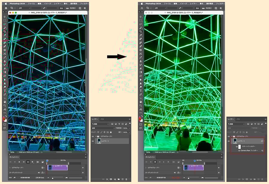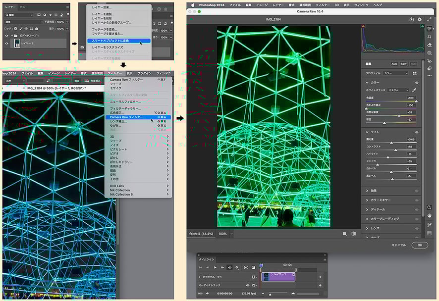 動画ファイルのレイヤーを「スマートオブジェクト」に変換し、「CameraRawフィルター」で目的の補正を行います。