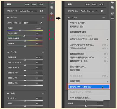 PC環境の悪さでカーソルがレインボーで回っていたり、少しCameraRawの調整に「重さ」を感じる時などは、この「設定をXMPに書き出し」機能を使用してそこまでの調整を書き出すようにしましょう。