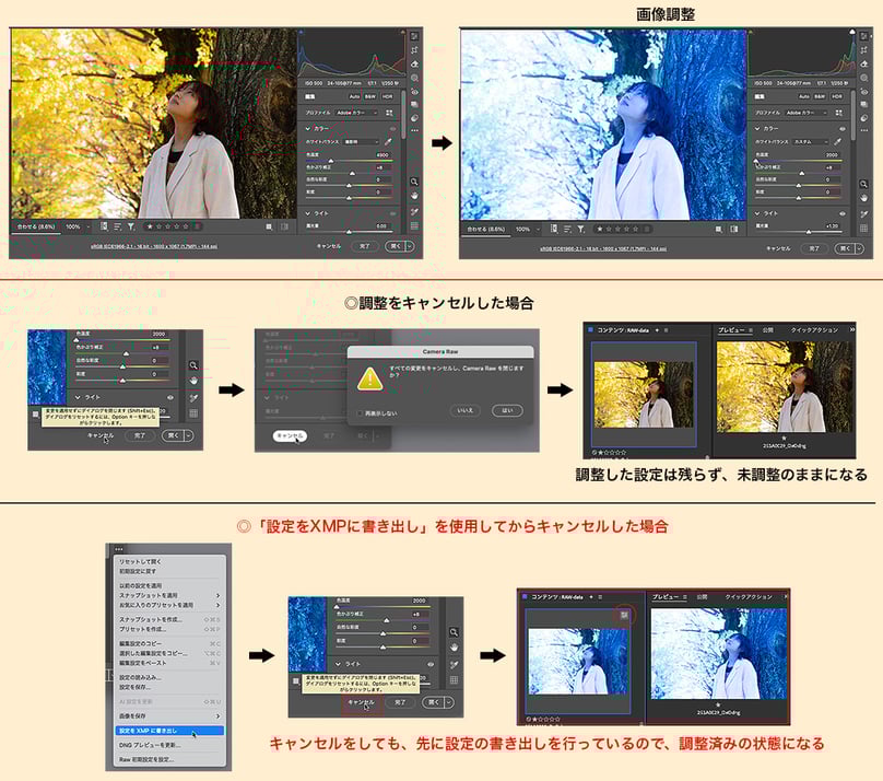 🔴例として、作業中にただキャンセルした場合と、「設定をXMPに書き出し」を行ってからキャンセルした場合の違いを見ます。