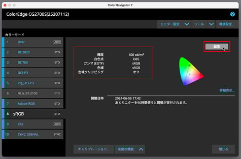 例えば「sRGB」のデフォルトプリセットは「100cd、D65」ですが、明るさを変えたい場合などの時は『編集』から変更を行います。