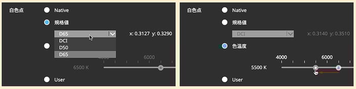◎白色点:プリセットでは、「D65、D50、DCI」が選べますが、写真の場合は、WEBやデバイス向けであれば「D65」、印刷向けであれば「D50」を選択します。