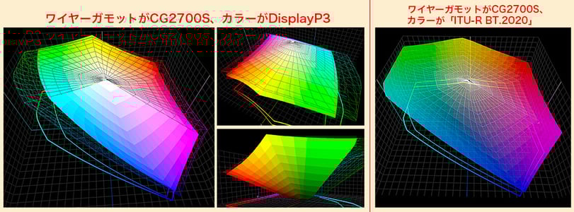 上図は、「CG2700S」と「DisplayP3カラースペース」の比較ですが、赤から緑の一部にかけてはモニターよりも彩度が広いエリアがありますが、飛び出しているのは僅かです。その部分はもとより再現できない部分ですので、色域クリッピングはオフの方が色再現が良いです。